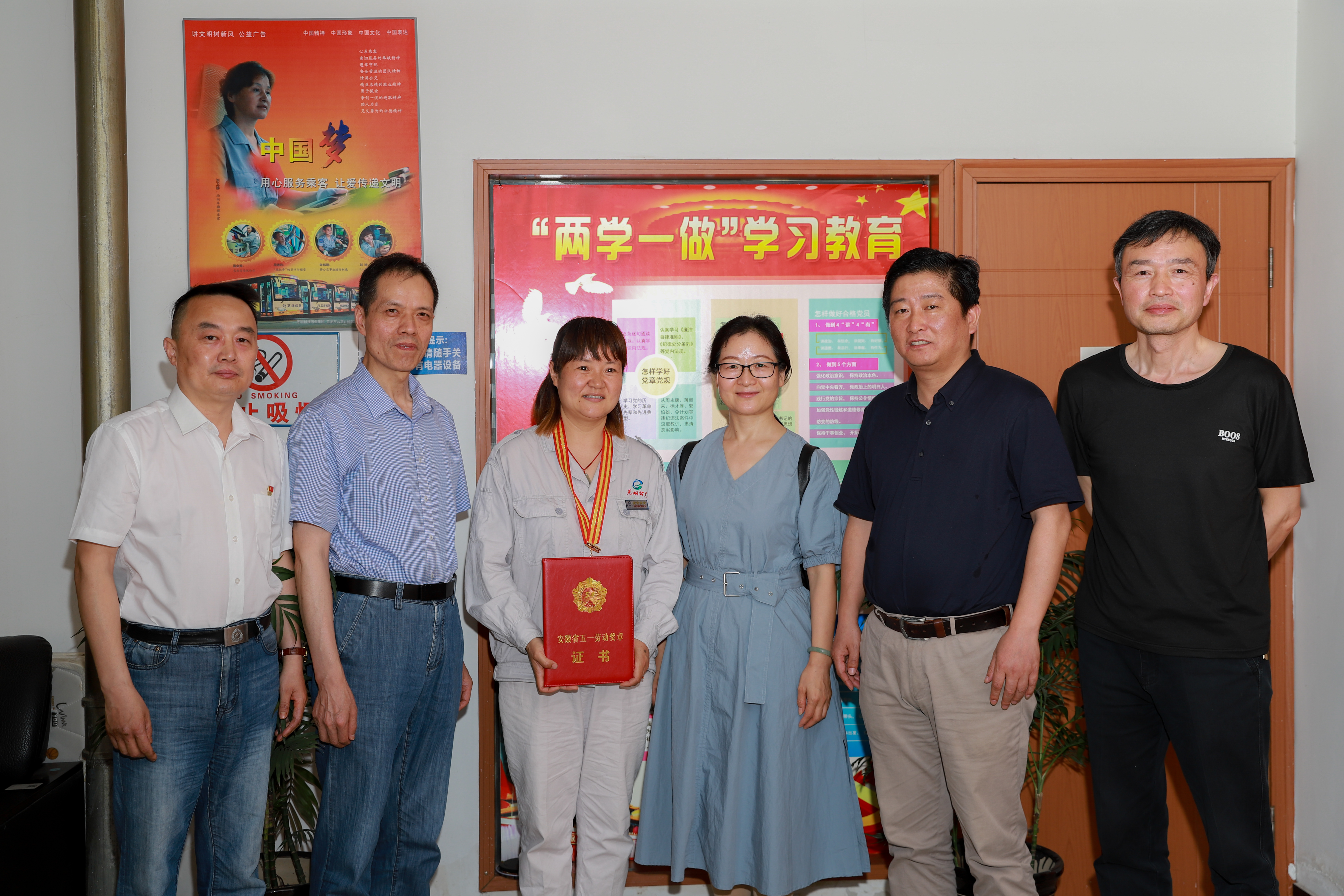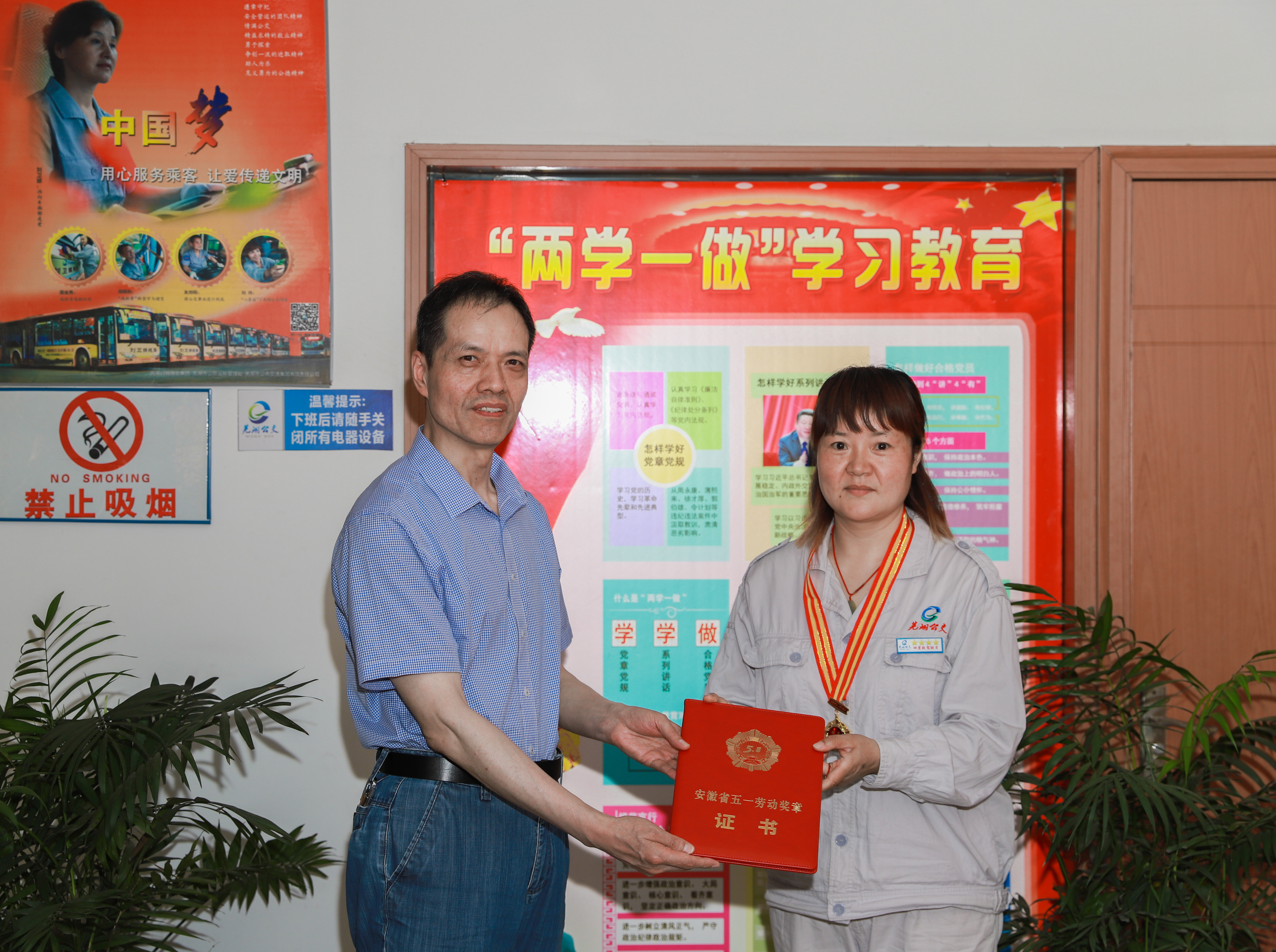 2021年5月25日下午,市總工會黨組成員、經(jīng)審委主任許金芳,經(jīng)審委辦公室主任劉素秋一行來到蕪湖公交集團,為30路駕駛員王華頒發(fā)安徽省“五一勞動獎?wù)隆焙蜆s譽證書。